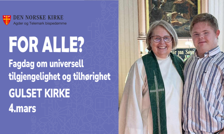 Fagdagen vil handle om likeverdig tilgjengelighet og tilhørighet - Hvordan kan vi fjerne fysiske og ikke-fysiske barrierer? (Jf. Kirkemøtevedtak 7/23 om Universell tilgjengelighet) Les mer her |