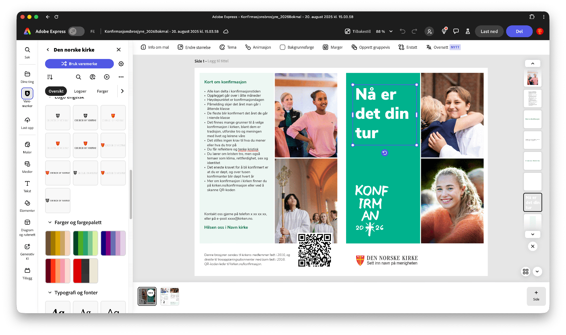 Adobe Express introduseres som nytt designverktøy for alle ansatte og frivillige i Den norske kirke over nyttår. Adobe Express er et brukervennlig, fleksibelt og rimelig verktøy som gjør det enklere og raskere å lage gode design – både til digitale kanaler og trykksaker – i tråd med kirkens visuelle profil. | |